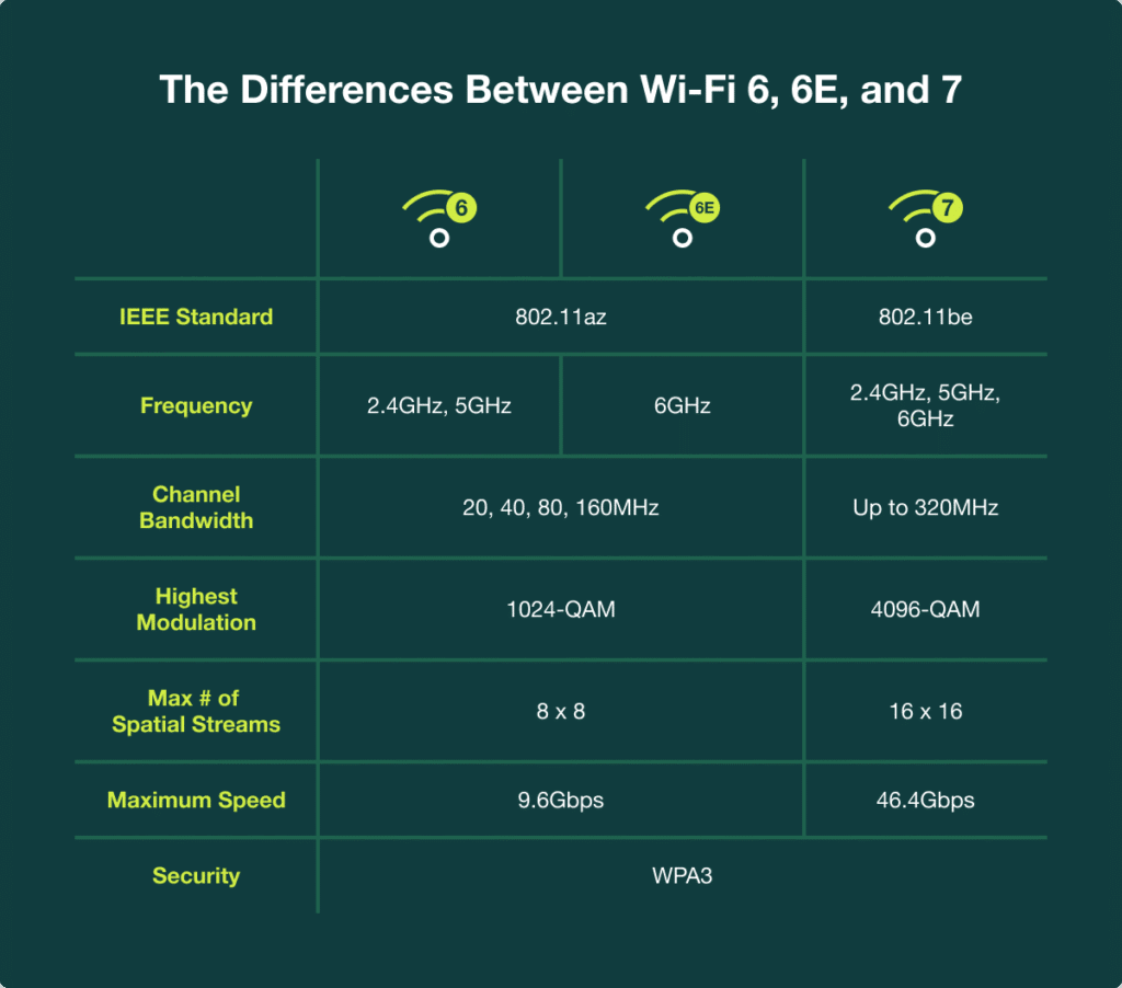 Wi-Fi 7 delivers an overall better online experience than previous iterations like Wi-Fi 6 and Wi-Fi 6E, making it an ideal solution for smart homes with multiple users and businesses. Here’s how it measures up: